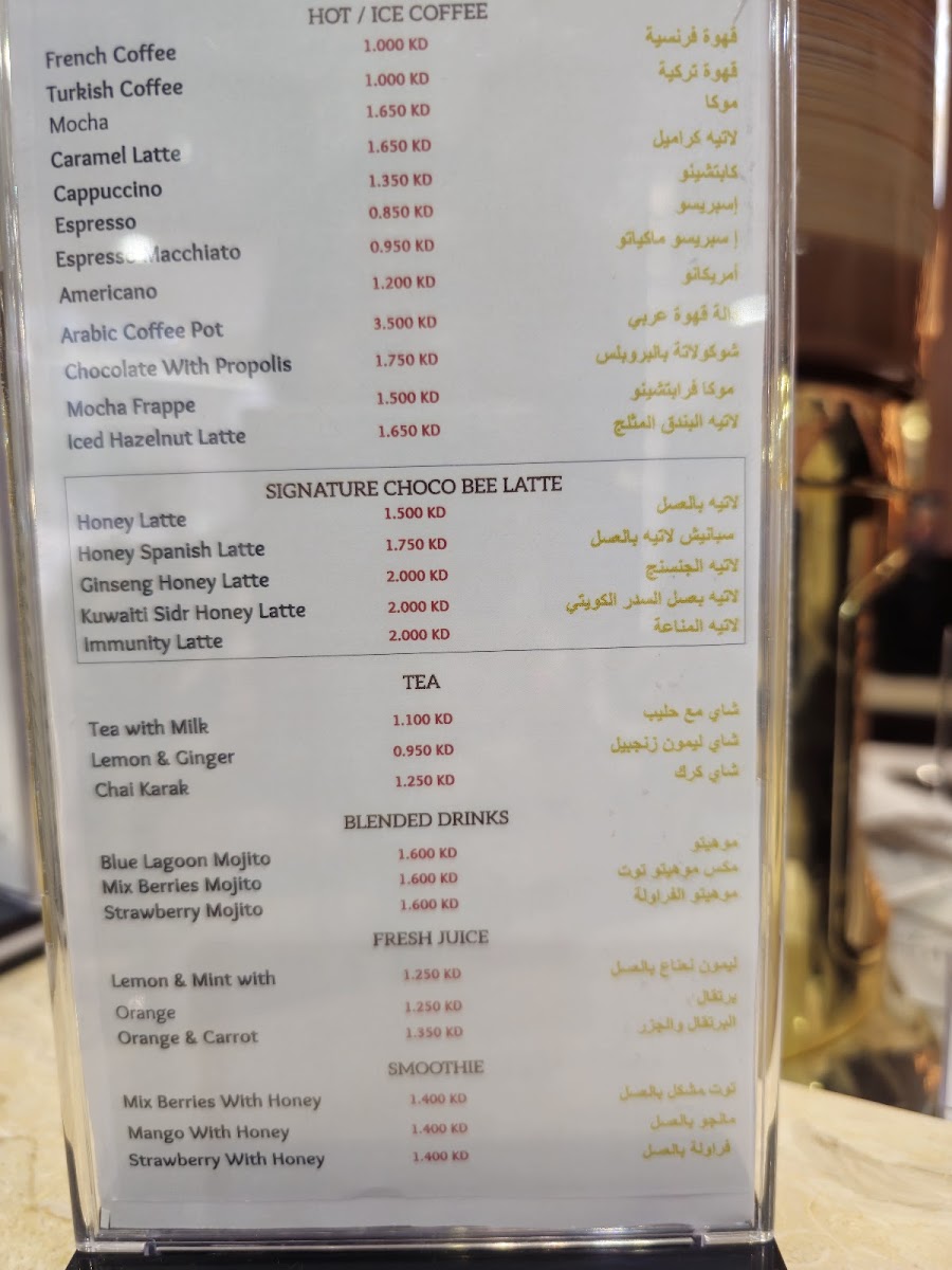 But the true magic happens when you venture towards the dessert section. The San Sebastian Cheesecake (KWD 2.200) is a showstopper—drizzled with luscious sidr honey, its creamy texture and subtle sweetness will have you craving more. Or treat yourself to a slice of the Tiramisu Cake (KWD 8.000), where espresso blends harmoniously with honey and royal jelly, creating an experience that's both indulgent and energizing.